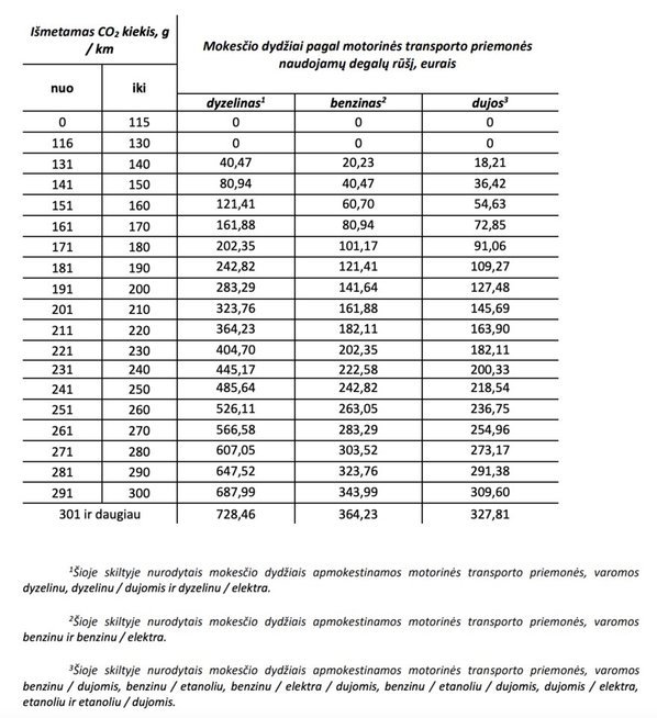 Tikslus dydis priklausys nuo automobilio išmetamo CO2 kiekio ir degalų rūšies. Pavyzdžiui, jei benzinu varomo automobilio išmetamas CO2 yra 141 g/km, įstatyme numatytas mokesčio dydis siekia 30 Eur. Jį padauginus iš Valstybės duomenų agentūros paskelbto indeksavo koeficiento 1,349, mokesčio dydis bus 40,47 Eur.