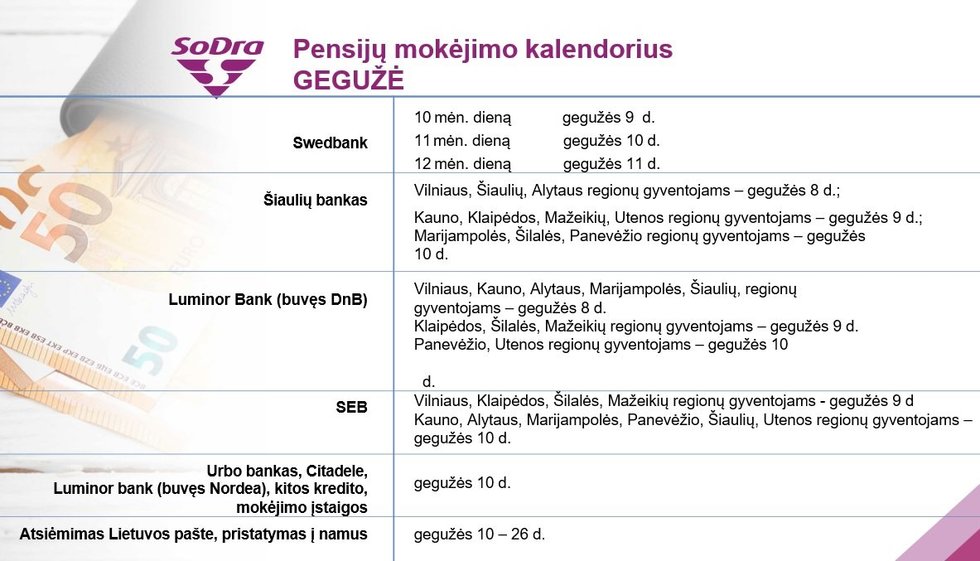 Antradienį „Sodra“ taip pat skelbia, kada gegužės mėnesį mokės ne tik išmokas, bet ir skirtingas pensijas.