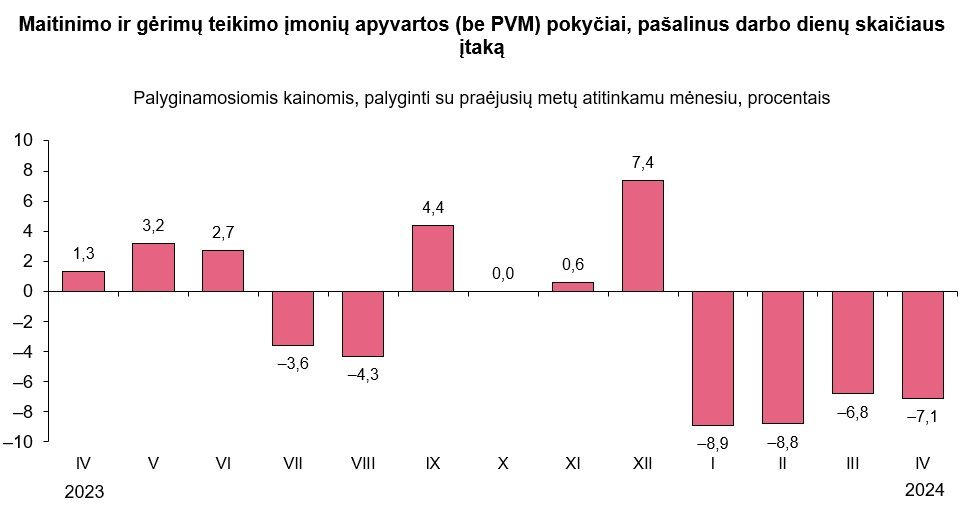 Jos duomenimis, 2024 m. balandį palyginti su 2023 m. balandžiu, maitinimo ir gėrimų teikimo įmonių apyvarta palyginamosiomis kainomis sumažėjo 7,1 proc.