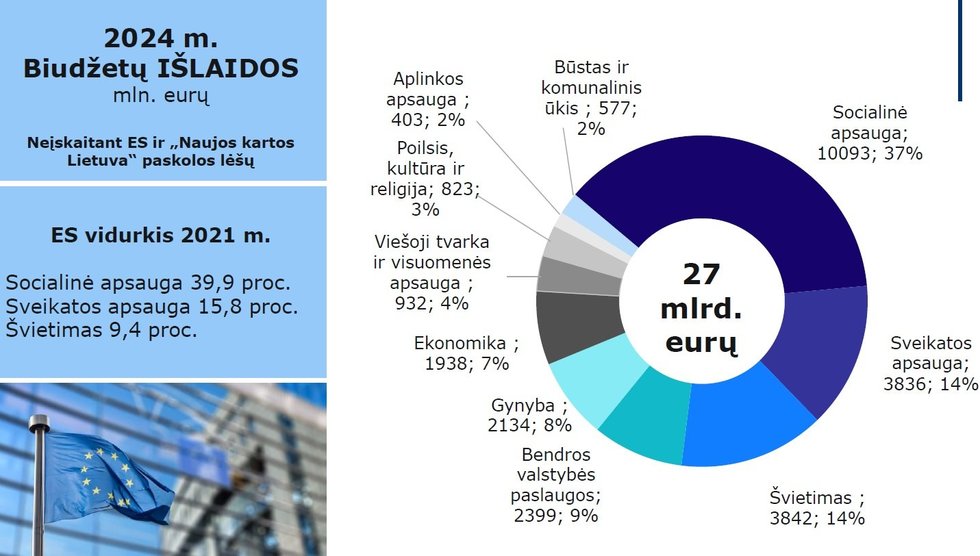 Projekte numatyta per 20,5 mlrd. eurų išlaidų (jos auga 7,9 proc. lyginant su 2023 m., arba 1,49 mlrd. eurų), iš kurių didžiausia dalis skirta socialinei apsaugai – daugiau nei 10 mlrd. eurų (papildomai 977 mln. eurų, lyginant su 2023 metais).