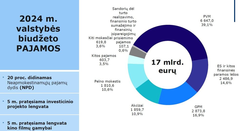 2024 metų valstybės biudžeto projekte numatyta daugiau nei 17 mlrd. eurų pajamų. Lyginant su 2023 m. pajamos auga 9,4 proc. arba 1,46 mlrd. eurų.