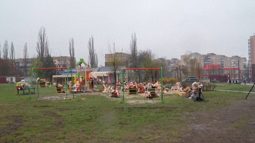 Ukrainos prezidentas Volodymyras Zelenskis apsilankė vietoje, kur įvyko kraupus rusų smūgis Kryvyj Riho mieste. Ten raketa pražudė devynis vaikus ir vienuolika suaugusiųjų. Gėlėmis ir pliušiniais žaislais nuklota žaidimų aikštelė tapo skaudžiu šio nusikaltimo simboliu.