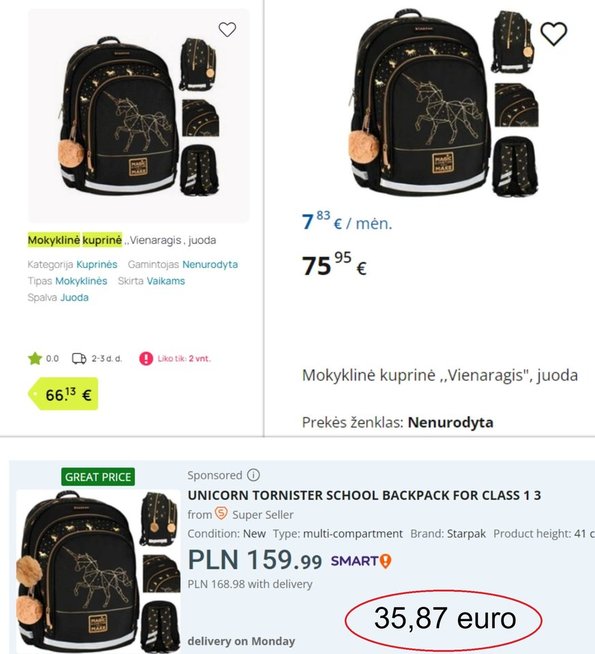 Taigi, iš pradžių nusprendžiau niekur nevykti, o patikrinti lenkiškoje internetinėje parduotuvėje Allegro.pl kuprinių kainas. Ir kaip nustebau pamačiusi, kad ten jos dvigubai pigesnės. Pavyzdžiui, ta pati kuprinė, kuri Lietuvoje kainuoja 75 eurus, Lenkijoje atsieitų jau 36 eurus. Žinoma kainuotų atsiuntimas, bet šios išlaidos siektų tik apie 5 eurus“, – skaičiavo moteris.
