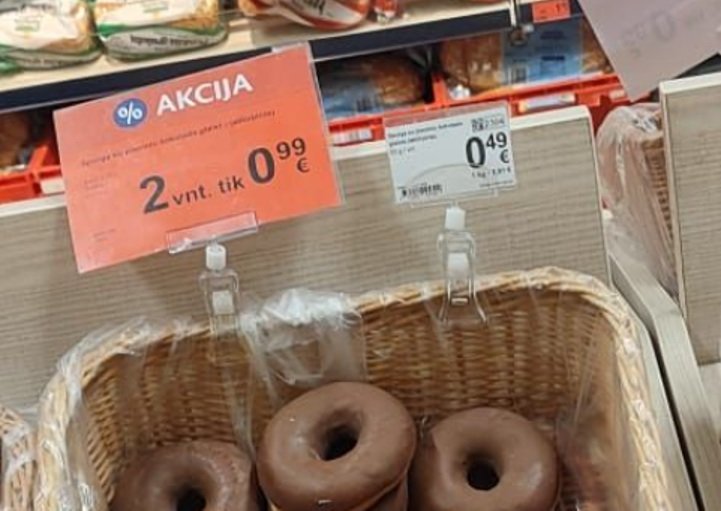 Tačiau šalia buvo ir įprasta spurgų kaina 0,49 euro už vieną saldėsį. Taigi, perkant 2 spurgas be nuolaidos kaina būtų 0,98 euro – 1 centu mažiau nei su ja.