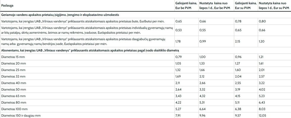 Mėnesinio mokesčio kaina vilniečiams ir rajonų, kuriuos aptarnauja „Vilniaus vandenys“, gyventojams išlieka viena žemiausių Lietuvoje. Palyginimui Kaune geriamojo vandens apskaitos prietaisų ir nuotekų apskaitos prietaisų įsigijimo, įrengimo ir eksploatavimo užmokesčio paslaugų mėnesinė kaina butų gyventojams yra 1,07 Eur be PVM, Klaipėdoje – 0,74 Eur be PVM, Šiauliuose – 0,88 Eur be PVM.