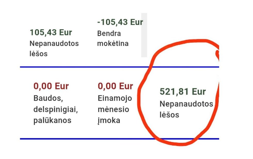 Pvz., viena moteris pasidalijo, kad „nepanaudotos lėšos“ pas ją rodomos 105,43 euro, o bendra mokėtina suma yra su minusu, t. y. –105,43 euro.