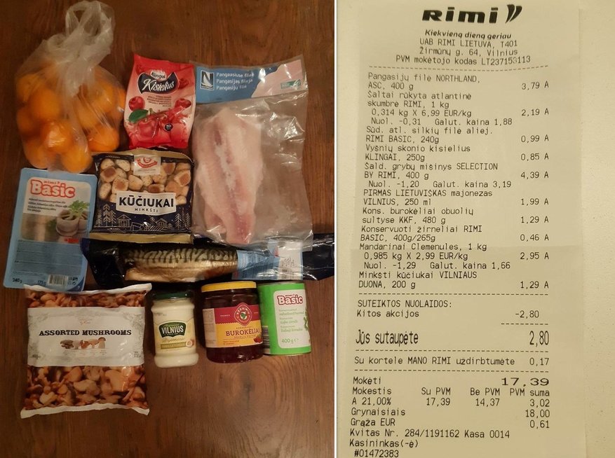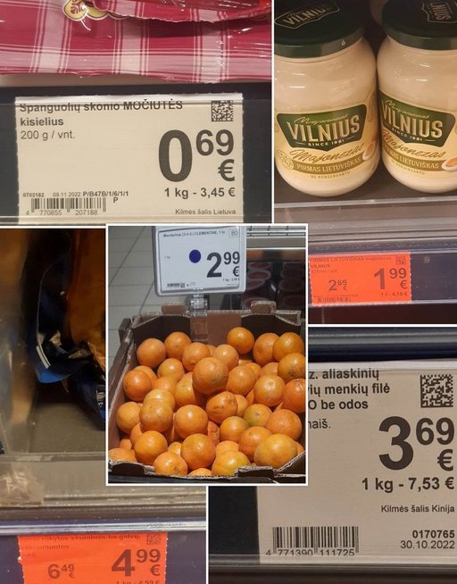 Čia 176 g. silkių filė aliejuje kainavo 1,15 euro, šaltai rūkytos skumbrės 1 kg atsiėjo 6,49 euro, o 300 g. viena žuvis – 1,9 euro. Šaldyta Jūrinių lydekų filė 880 g kainavo 3,69 euro, o konservuoti grybai 230 g – 1,39 euro, konservuotų burokėlių 380 g – 0,95 euro, konservuotų žirnelių 280 g – 1,09 euro, majonezo 400 g – 1,99 euro, kūčiukai 200 g – 1,09 euro. Vienas kilogramas mandarinų kainavo 1,89 euro. Spanguolių kisieliaus 250 g pakuotė atsiėjo 0,85 euro.