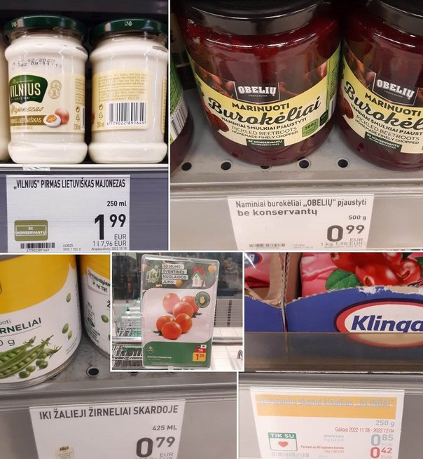 Čia 220 g silkių filė aliejuje kainavo 1,15 euro, šaltai rūkytos skumbrės 1 kg atsiėjo 4,99 euro, o 300 g viena žuvis – 1,49 euro. Šaldyta menkių filė 490 g kainavo 3,69 euro, o konservuoti grybai 530 g – 2,69 euro, konservuotų burokėlių 500 g – 0,79 euro, konservuotų žirnelių 400 g – 0,79 euro, majonezo 475 g – 1,99 euro, kūčiukų 200 g – 1,45 euro. Vienas kilogramas mandarinų kainavo 2,99 euro. Spanguolių kisieliaus 200 g pakuotė atsiėjo 0,69 euro.