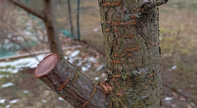 Šakos turėtų būti pjaunamos trimis pjūviais: pirmas pjūvis daromas šakos apačioje 25–30 cm nuo stiebo. Įpjaunama ketvirtadalis stiebo. Antras pjūvis daromas iš viršaus 5 cm toliau kaip apatinis pjūvis. Trečiu pjūviu iš apačios, atsargiai prilaikant ranka, apipjaunama žiediškai, baigiama pjauti. Paskutinis šakos pjūvis turi būti ne lygiagretus stiebui, bet statmenas pjaunamai šakai.