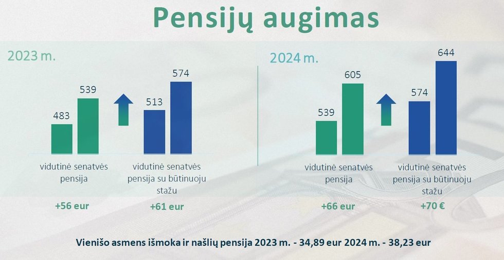 Tiems gyventojams, kurie yra sukaupę būtinąjį stažą, vidutinė senatvės pensija augs kiek daugiau – 70 eurų. T.y. nuo dabartinių 574 eurų iki 644 eurų.
