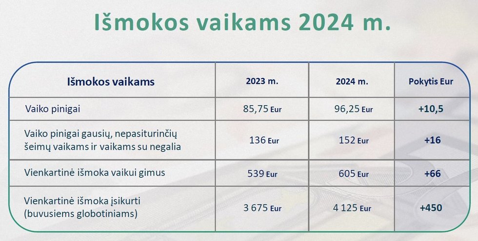 Tuo metu vaiko pinigai turėtų didėti 12,2 proc. arba 10,5 euro – nuo dabartinių 85,75 euro iki 96,25 euro per mėnesį.