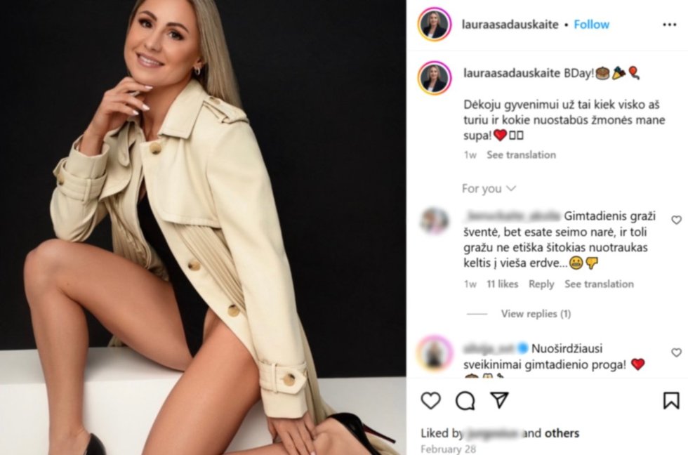 Lietuvos penkiakovininkė, olimpinė ir pasaulio čempionė, Seimo narė, socialdemokratė Laura Asadauskaitė-Zadneprovskienė vasario 28-ąją, minėdama savo 41-ąjį gimtadienį, socialiniame tinkle pasidalijo atvira nuotrauka. Nuotraukoje ji matoma su aukštakulniais, bodžiu, šviesiu švarkeliu ir apnuogintomis kojomis.