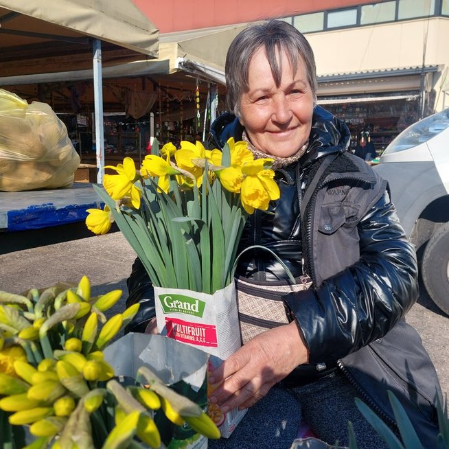 Su pavasariška nuotaika, darbščiu vyru ir glėbiais narcizų į Alytaus turgų prisistatė Simno gyventoja Danutė Juškauskienė.